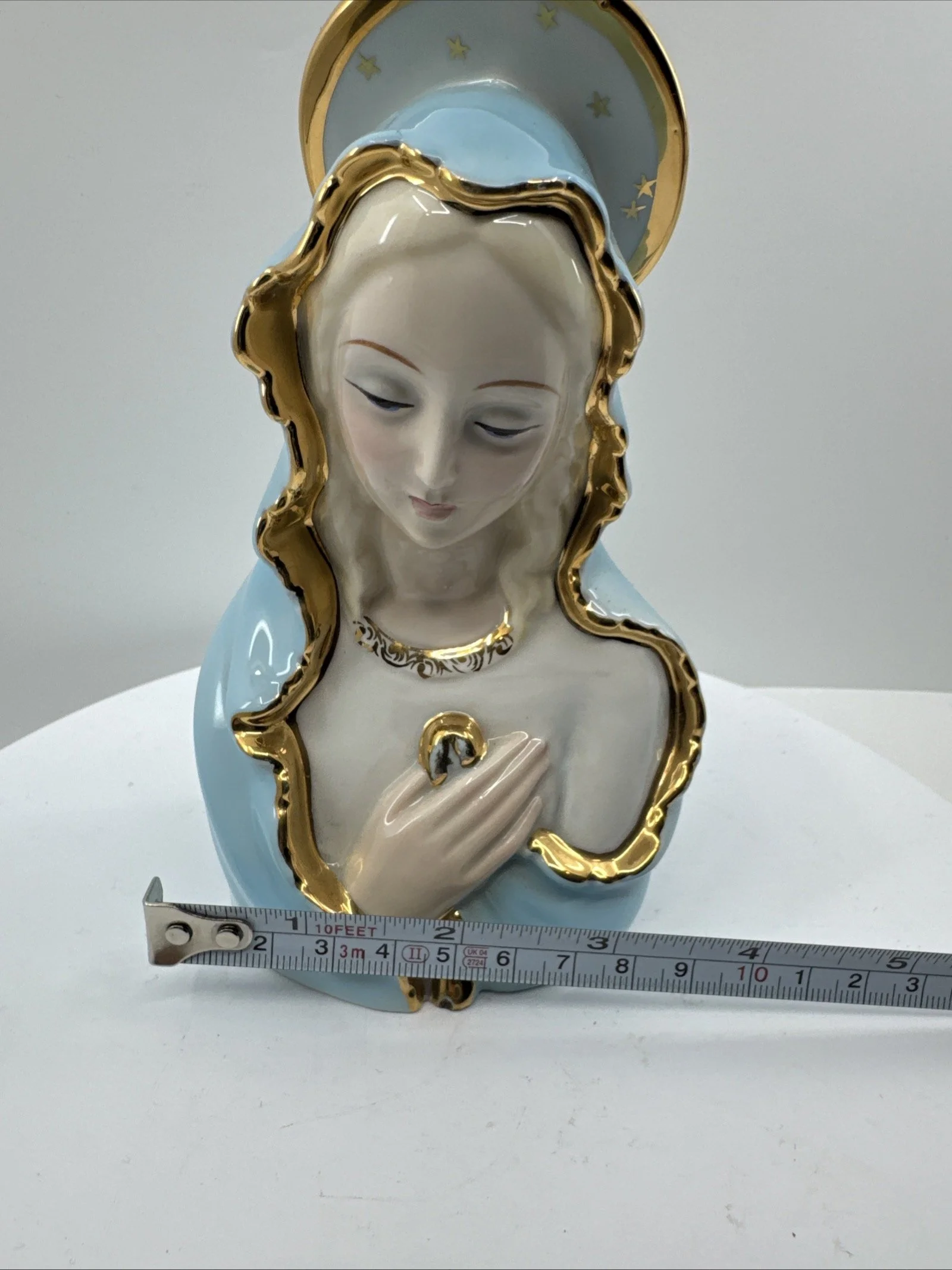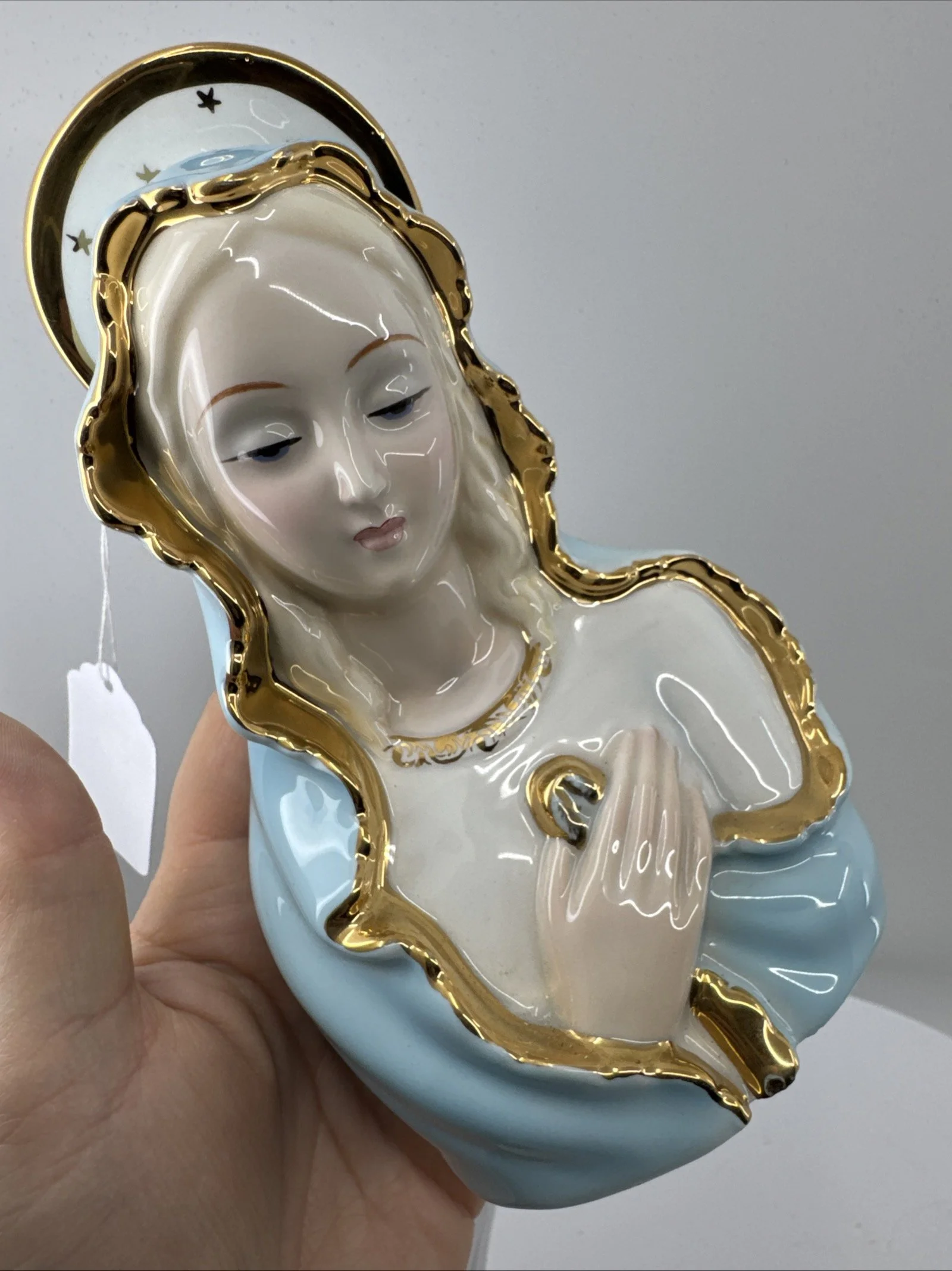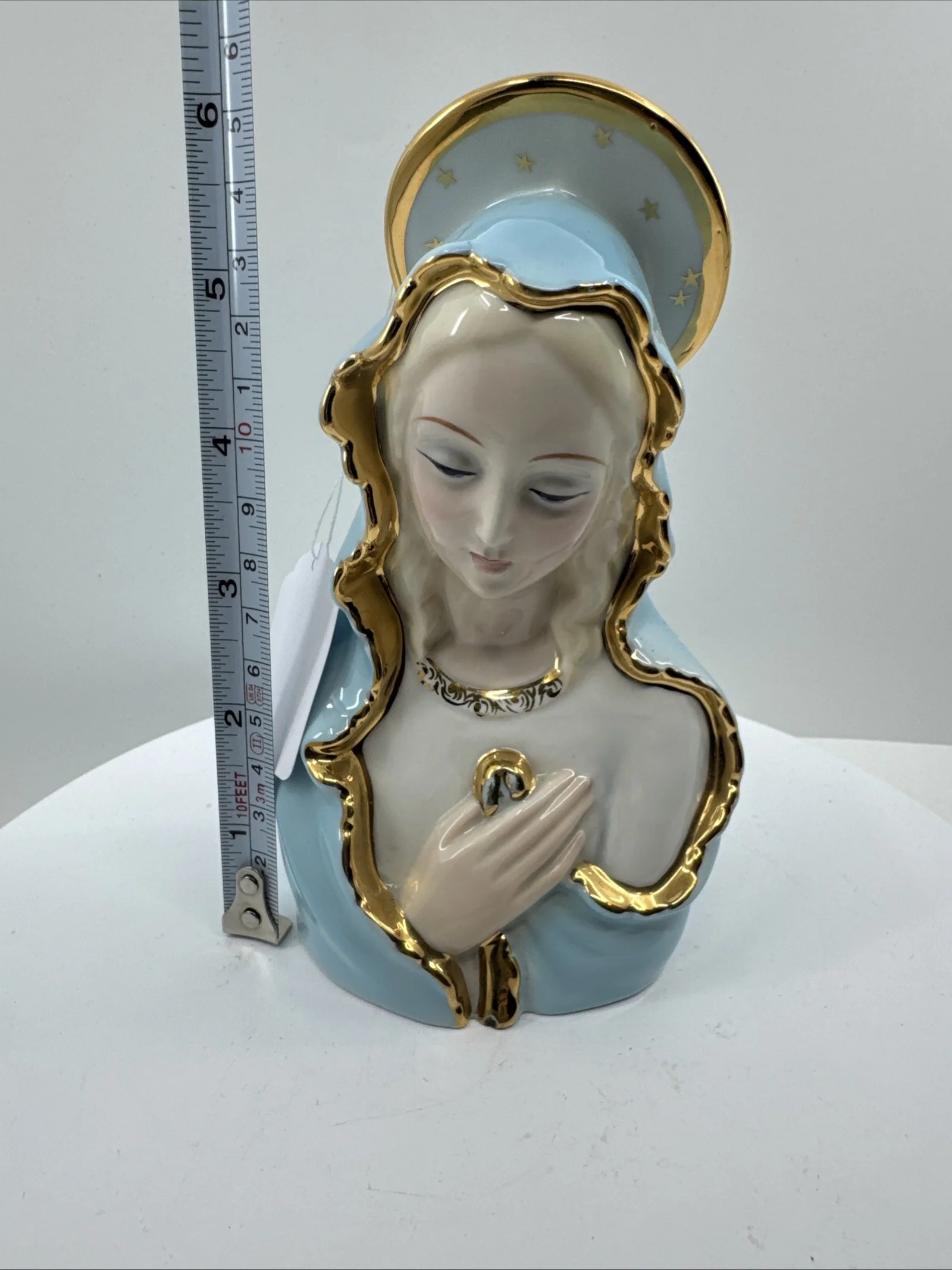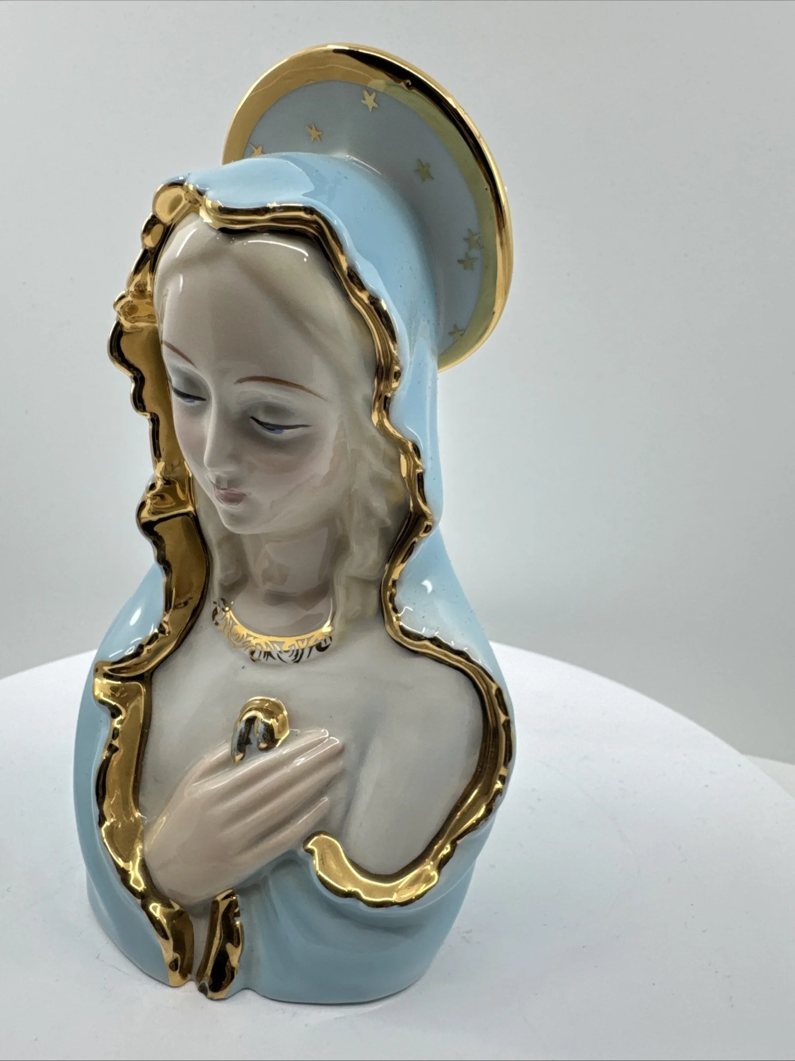 This piece is a rare and excellent condition 1950s Japan Sacred Blue Gold Star Madonna figure, made of ceramic. The statue features the Virgin Mary as the central figure, embodying the essence of a sacred past.