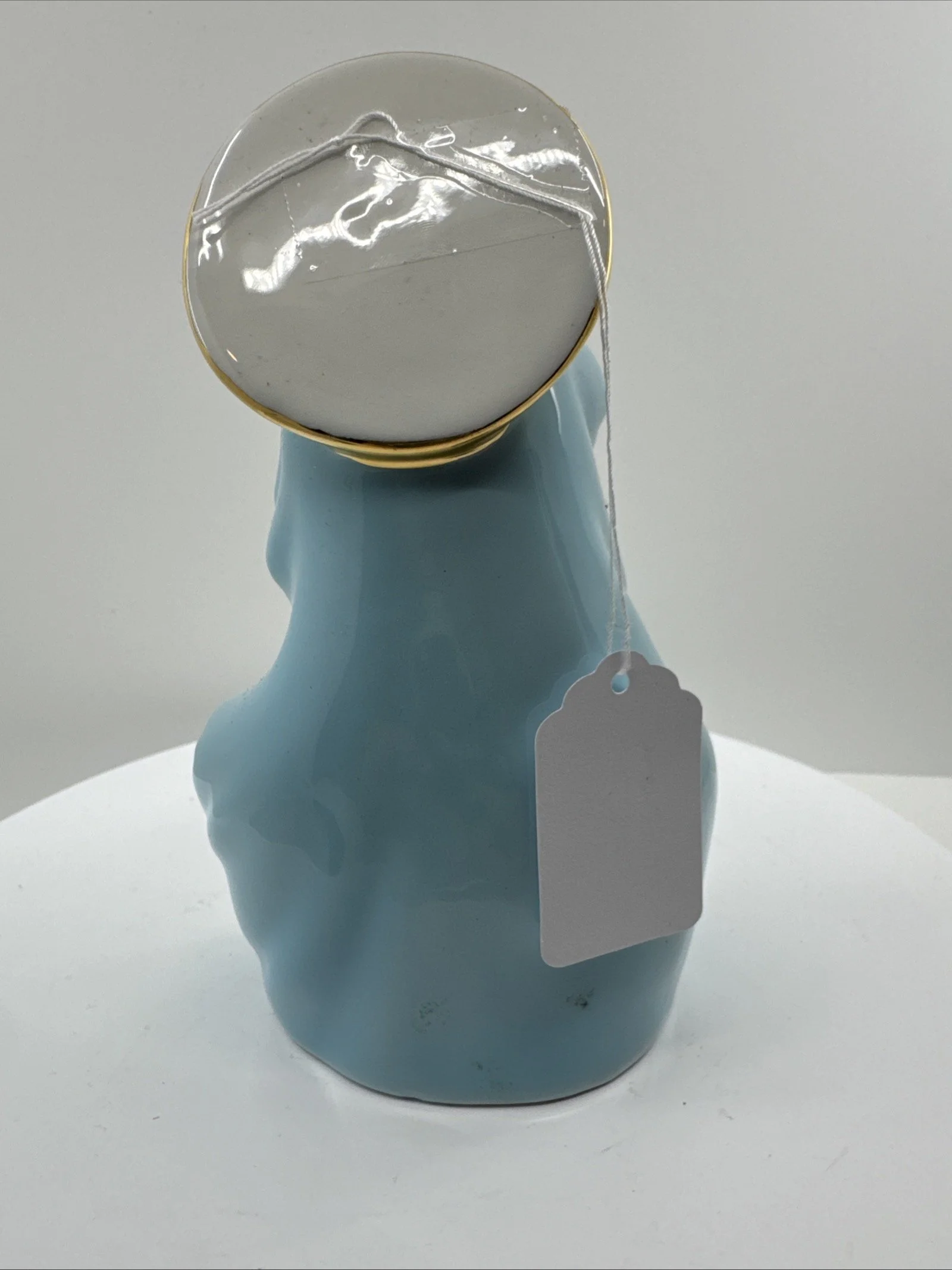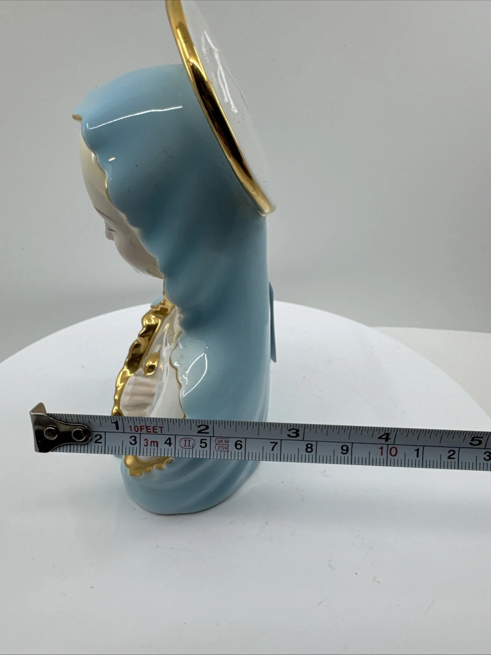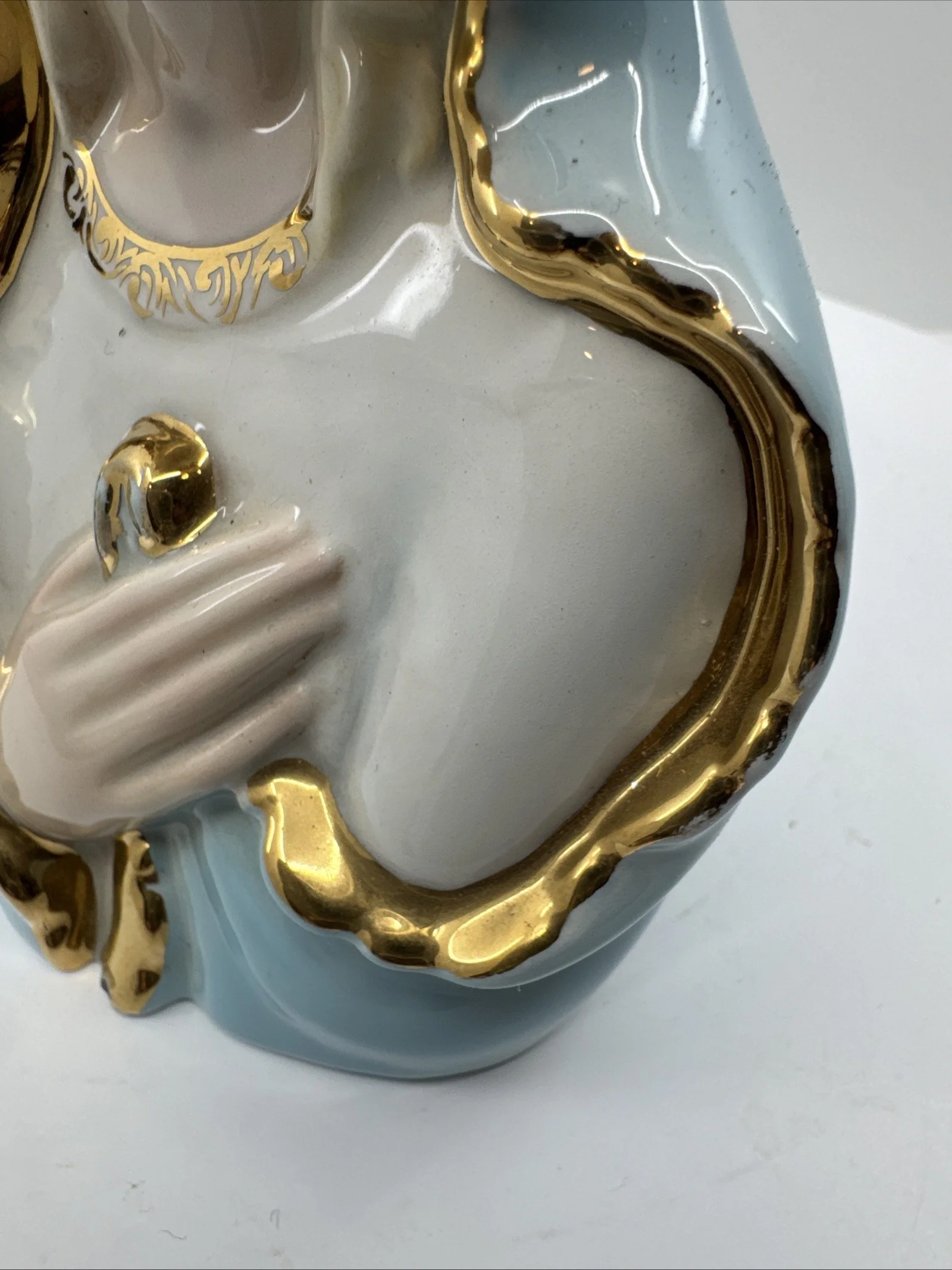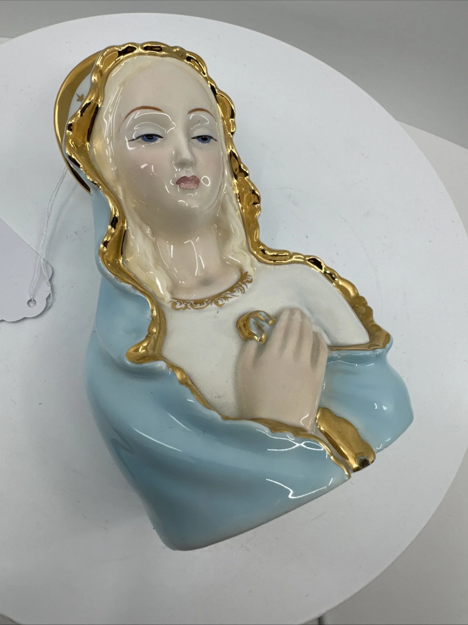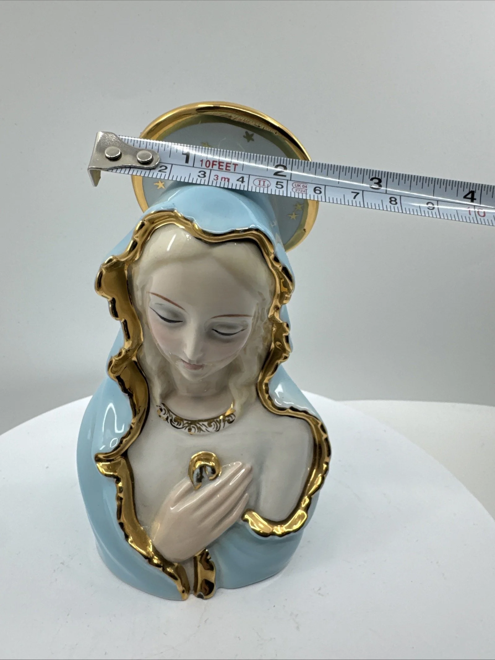 This piece is a rare and excellent condition 1950s Japan Sacred Blue Gold Star Madonna figure, made of ceramic. The statue features the Virgin Mary as the central figure, embodying the essence of a sacred past.