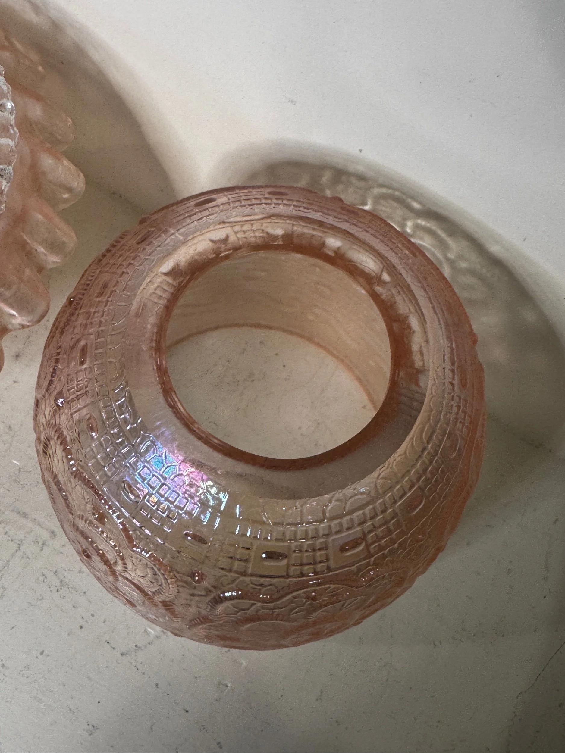 The pink glass is 1950s soft baby pink with the rare iridescent glass shine to it. The Persian rose pattern is lovely and eclectic and the lace edged glass of the clear insert (which is aesthetic and also is there for extra glass protection with your tea light candles) and highlights the pink bottom ruffle glass edge. This is the prettiest fairy lamp i’ve ever seen.